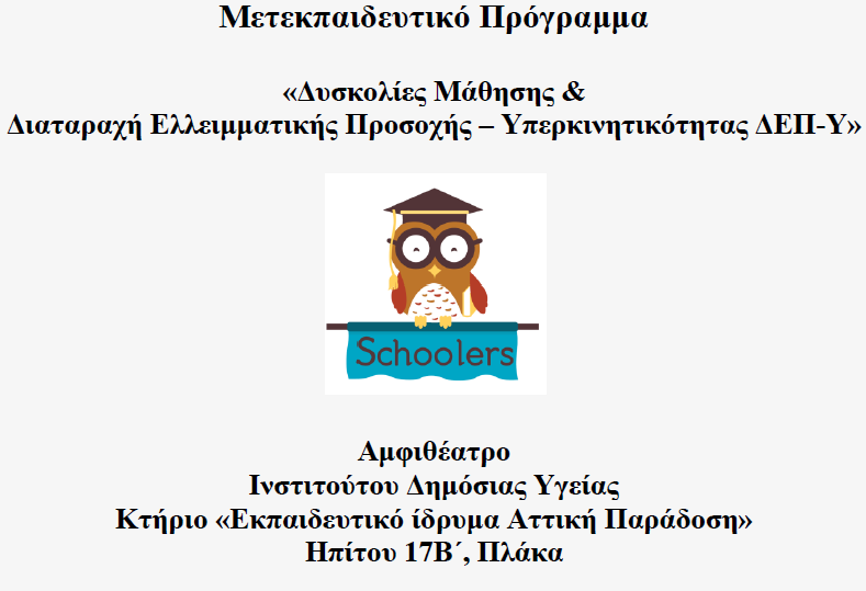 διοργανώνει πρόγραμμα μετεκπαίδευσης σχετικά με την πρόληψη, την ανίχνευση και διαχείριση των μαθησιακών δυσκολιών, την ΔΕΠ-Υ και άλλες καταστάσεις που αφορούν το σχολείο.