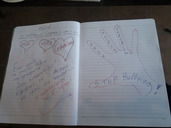 Αρχικά, συζητήσαμε με τα παιδιά για την έννοια του εκφοβισμού και αποσαφηνίσαμε τις διαφορές μεταξύ απλού πειράγματος, κοροϊδίας και εκφοβισμού. Στη συνέχεια, αναλύσαμε τις διάφορες μορφές που μπορεί να λάβει ο εκφοβισμός καθώς και τις συνέπειες που μπορεί να έχει για όσους εμπλέκονται σε τέτοια περιστατικά. Στο τέλος, επικεντρωθήκαμε στους πιθανούς τρόπους διαχείρισης τέτοιων καταστάσεων και στη σημασία που έχει η αναζήτηση βοήθειας και στήριξης από άτομα που εμπιστευόμαστε. Καθ΄ όλη τη διάρκεια της παρέμβασης τα παιδιά έδειξαν ζωηρό ενδιαφέρον και συμμετείχαν ενεργά εκφράζοντας απορίες και απαντώντας στις ερωτήσεις μας. Η συζήτηση ολοκληρώθηκε με την παρουσίασητης ηλεκτρονικής πλατφόρμας και των υπηρεσίων που μπορούν να χρησιμοποιήσουν τα παιδιά ανώνυμα και δωρεάν.
