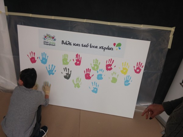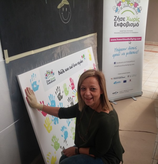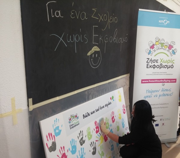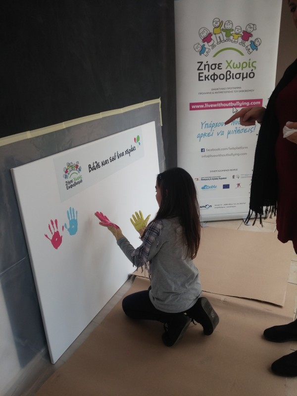 Η δράση ολοκληρώθηκε με τη δημιουργία του πολύχρωμου καμβά. Με τη βοήθεια εθελοντών μαθητών και τις δασκάλες τους, τα παιδιά βούτηξαν το χέρι τους στην μπογιά και άφησαν το προσωπικό τους «αποτύπωμα» για ένα σχολικό περιβάλλον χωρίς εκφοβισμό. Το πολύχρωμο τελικό αποτέλεσμα συμβολίζει την προσωπική δέσμευση των παιδιών για μια ενεργητική αντιμετώπιση του εκφοβισμού στα πλαίσια της οποία αποδέχονται οι ίδιοι τη διαφορετικότητα των άλλων και αλληλοϋποστηρίζονται μεταξύ τους όταν χρειάζεται. Ο καμβάς θα παραμείνει στο χώρο του σχολείου αποτελώντας μια καθημερινή υπενθύμιση για τη κοινή αυτή δέσμευση.