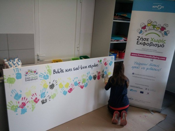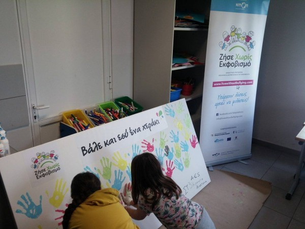 Η δράση ολοκληρώθηκε με τη δημιουργία 3 πολύχρωμων καμβάδων. Τα παιδιά από κάθε τμήμα βούτηξαν το χέρι τους στις μπογιιές και άφησαν το προσωπικό τους «αποτύπωμα» δεσμευόμενοι παράλληλα να συνεισφέρουν ο καθένας όσο μπορεί σε ένα σχολικό περιβάλλον χωρίς εκφοβισμό. Τα παιδιά ενθαρρύνθηκαν να υιοθετήσουν μια ενεργητική αντιμετώπιση του εκφοβισμού στα πλαίσια της οποίας αποδέχονται οι ίδιοι τη διαφορετικότητα των άλλων και αλληλοϋποστηρίζονται μεταξύ τους όταν αυτό χρειάζεται. Οι καμβάδες θα παραμείνουν στο χώρο του σχολείου αποτελώντας μια καθημερινή υπενθύμιση για τη συλλογική αυτή δέσμευση.
