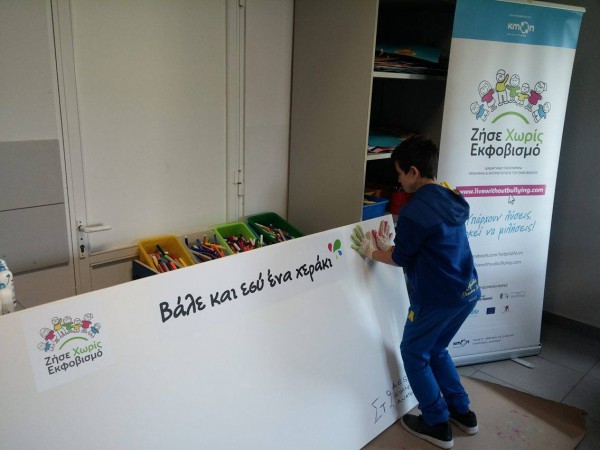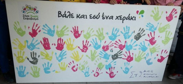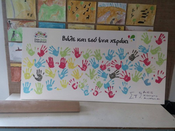 Την Τετάρτη, 1 Μαρτίου 2017, μας φιλοξένησε το AES Κολλέγιο Ανατόλια για να υλοποιήσουμε τη τρίτη δράση στα πλαίσια της καμπάνιας ευαισθητοποίησης «Βάλε και εσύ ένα χεράκι» με τους μαθητές της ΣΤ’ Δημοτικού. Η καμπάνια έχει ως σκοπό την ευαισθητοποίηση και τον αναστοχασμό σχετικά με τον εκφοβισμό μέσα από μια διαδραστική συζήτηση και την δημιουργία ενός πολύχρωμου καμβά από τα προσωπικά αποτυπώματα όλων των μαθητών.