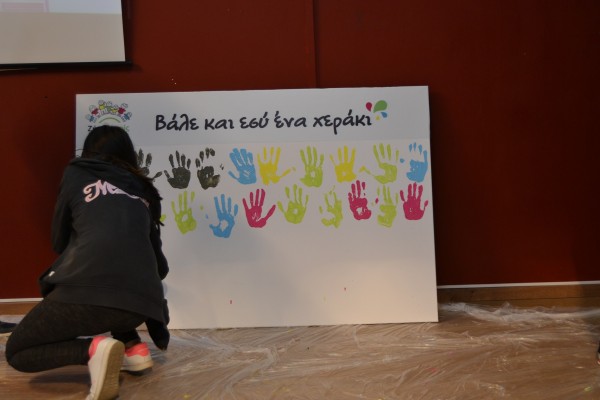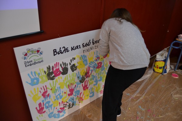 Η δράση όμως δεν σταμάτησε εκεί! Με τη βοήθεια εθελοντών - μαθητών ξεκινήσαμε τη δημιουργία του πολύχρωμου καμβά της καμπάνιας. Κάθε αποτύπωμα των παιδιών και μία δέσμευση «για ένα σχολείο χωρίς εκφοβισμό». Ο καμβάς παρέμεινε στο σχολείο και θα αποτελεί μια καθημερινή υπενθύμιση της δέσμευσης που αναλάβαμε όλοι μαζί σήμερα.