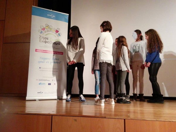 Η εκδήλωση πλαισιώθηκε δημιουργικά από ένα σύντομο θεατρικό δρώμενο που προετοίμασαν μαθήτριες του 2ου Δημοτικού Πυλαίας στέλνοντας το δικό τους μήνυμα κατά της ενδοσχολικής βίας.