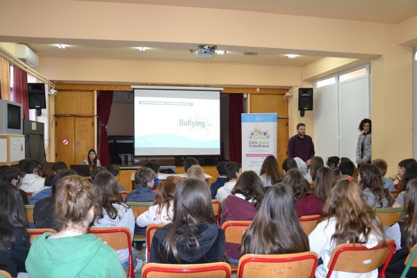 Η επίσκεψη ξεκίνησε με μια διαδραστική συζήτηση για τον εκφοβισμό. Οι 43 μαθητές της Α’ Γυμνασίου ήταν βασικοί πρωταγωνιστές χάρη στην έντονη και ουσιαστική συμμετοχή τους. Με την πολύτιμη βοήθειά τους μιλήσαμε για τις διάφορες μορφές εκφοβισμού, εντοπίσαμε τις διαφορές μεταξύ πειράγματος και εκφοβισμού και συζητήσαμε για τη σημασία της ενσυναίσθησης. Αφού παρακολουθήσαμε μια ταινία μικρού μήκους, συζητήσαμε πιθανούς τρόπους αντιμετώπισης εκφοβιστικών συμπεριφορών και όλοι μαζί συμφωνήσαμε ότι «Υπάρχουν λύσεις, αρκεί να μιλήσεις»!