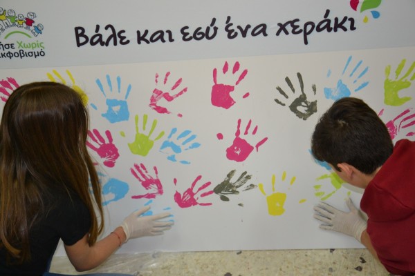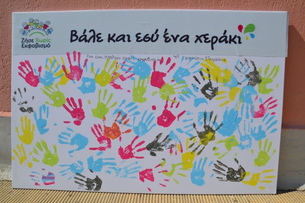 Στη συνέχεια φορέσαμε τα γάντια μας και με τη βοήθεια εθελοντών – μαθητών, κάθε μαθητής άφησε το προσωπικό του αποτύπωμα στον καμβά δεσμευόμενος συμβολικά «για ένα σχολείο χωρίς εκφοβισμό».