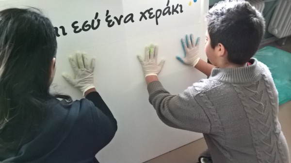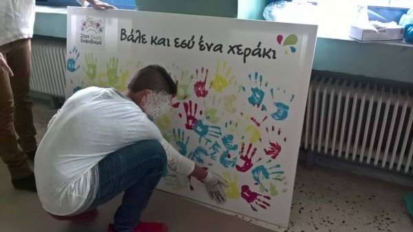 Στη συνέχεια τα παιδιά φόρεσαν τα γάντια τους και με τη βοήθεια εθελοντών – μαθητών, άφησαν το προσωπικό τους αποτύπωμα στον καμβά δεσμευόμενα συμβολικά να μην σιωπούν μπροστά σε περιστατικά εκφοβισμού με τα οποία έρχονται αντιμέτωπα. Όλοι οι μαθητές συμφώνησαν ότι θα πρέπει να αποδέχονται ο ένας τον άλλον όσο διαφορετικοί και αν είναι και να υποστηρίζουν και να βοηθούν όσο μπορούν συμμαθητές τους που περνούν δύσκολα στο σχολείο.