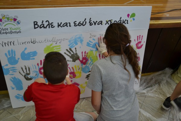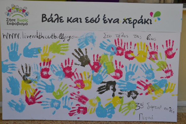 Στη συνέχεια εξοπλιστήκαμε με γάντια και με τη βοήθεια εθελοντών – μαθητών, κάθε μαθητής άφησε το προσωπικό του αποτύπωμα στον καμβά δεσμευόμενος συμβολικά «στο τέλος της βίας». Όλοι οι μαθητές συμφώνησαν να προσπαθήσουν να στέκονται περισσότερο κοντά σε μαθητές οι οποίοι εκφοβίζονται και να κάνει ό,τι μπορεί ο καθένας για να μην υπάρχει βία στο σχολείο.