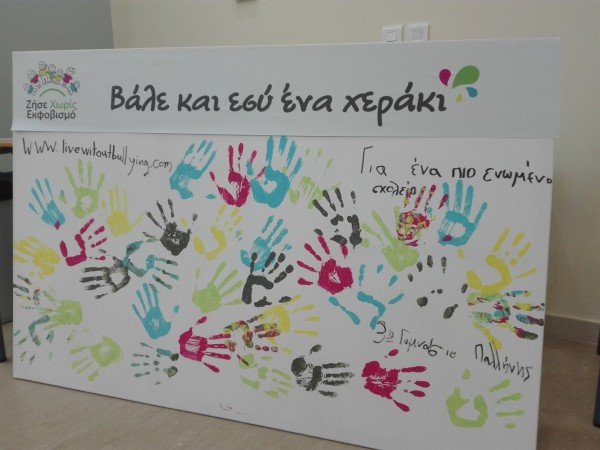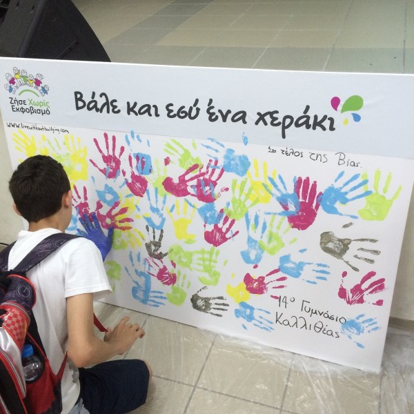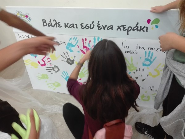 Στη συνέχεια φορέσαμε τα γάντια μας και με τη βοήθεια εθελοντών – μαθητών, κάθε μαθητής άφησε το προσωπικό του αποτύπωμα στον καμβά δεσμευόμενος συμβολικά «για ένα πιο ενωμένο σχολείο» και "στο τέλος της βίας". Όλοι οι μαθητές συμφώνησαν ότι θα προσπαθήσουν να στέκονται περισσότερο κοντά σε μαθητές οι οποίοι εκφοβίζονται και να κάνει ό,τι μπορεί ο καθένας για να μην υπάρχει βία στο σχολείο.