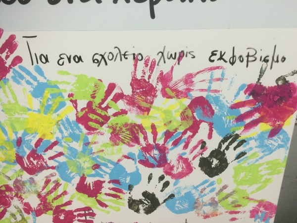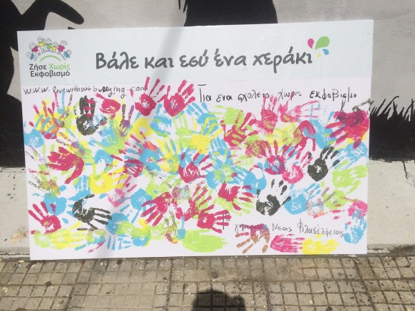 Αφού πρώτα συμφωνήσαμε όλοι για την αξία της υποστήριξης όσων δέχονται εκφοβισμό κατευθυνθήκαμε προς τον καμβά για να αφήσει ο καθένας το προσωπικό του αποτύπωμα δεσμευόμενος συμβολικά «για ένα σχολείο χωρίς εκφοβισμό». Όλοι οι μαθητές συμφώνησαν να προσπαθήσουν να στέκονται δίπλα σε μαθητές οι οποίοι εκφοβίζονται και να προσπαθούν να μην είναι κανένας μόνος του απέναντι στον εκφοβισμό!